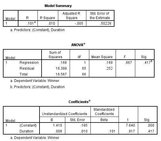 It shows that duration of the game does not have an statistical significant effect on the match up for both metric and categorical measurements. This means that both H1 and H2 are not supported