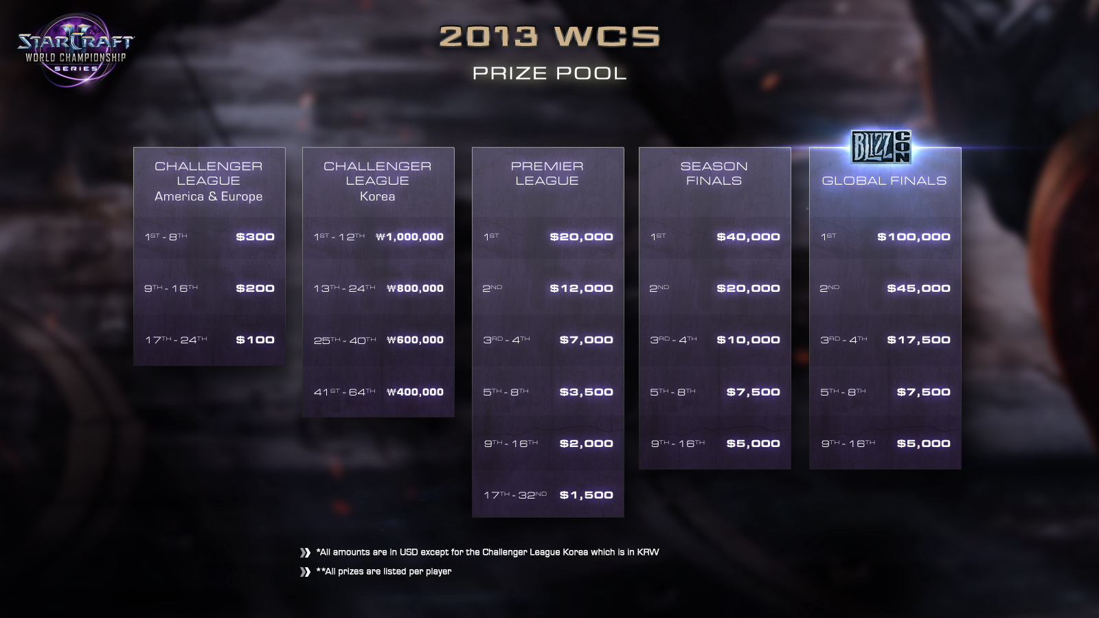The prize distribution for World Championship Series 2013 has been announced by Blizzard.