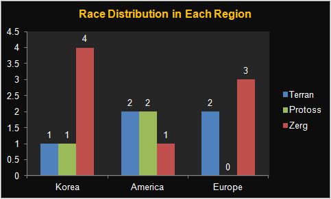 50% of the players are Zerg. Statistically, Zerg is the dominating race now. Apart from WCS America, the racial representation is not well distributed. There is no Protoss representative from WCS Europe, while WCS Korea has a Zerg heavy line up. Interestingly, each race has won a regional final.