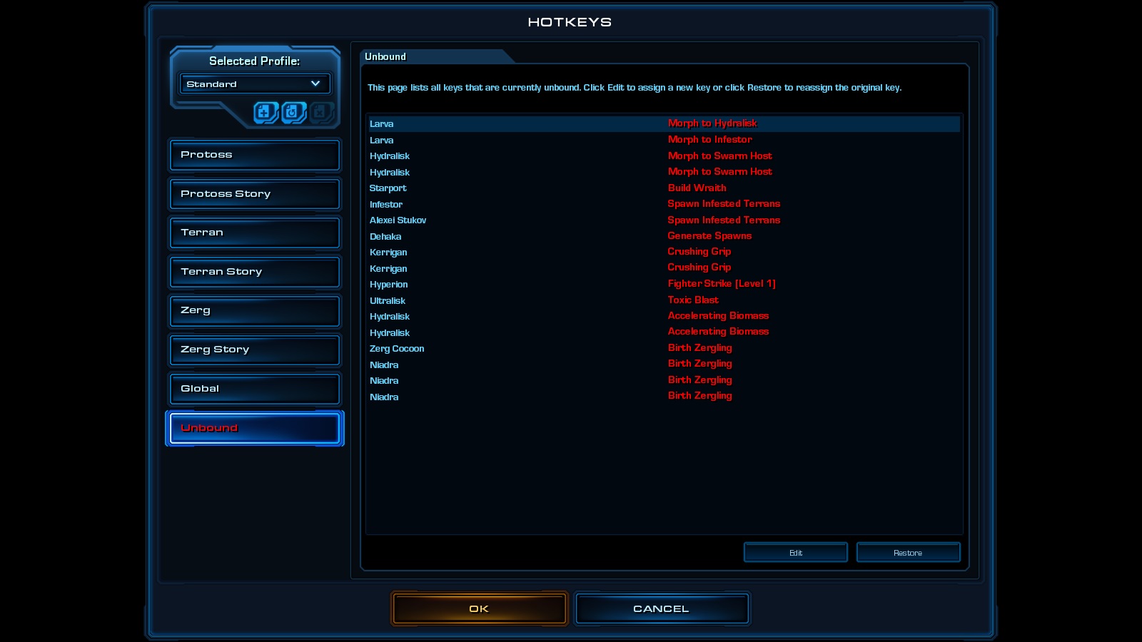 Apparently, there is a bug. For example, when I tried to manually edit the “morph Hydralisk” hotkey, the “morph Infestor” hotkey unbounded. Then, when I tried to edit the “morph Infestor” hotkey, the “morph Hydralisk” hotkey got unbounded. It just kept on looping. Obviously, I tried different hotkeys for them.