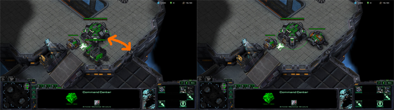 The Zerglings and Drones will reach the ramp when the command centre and barrack are still building. They will start attacking the buildings. You can repair the supply depot, but you cannot repair the command centre and the barrack as they are not completed. Eventually, the barrack will be forced to cancel. Once the barrack is cancelled, the Zerglings will swarm in which is obviously not ideal.