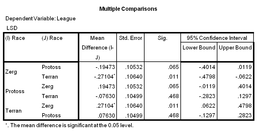 Basically, it compares each race with one another. Zerg-Protoss = .065 (not significantly different at p < .05), Zerg-Terran = .011 (significantly different at p< .05), Protoss-Terran = .468 (not significantly different at p < .05). This is not meaningful because the number of players in each league is structured to be proportionate to the total number of players to begin with. The mean of league placement is irrelevant.