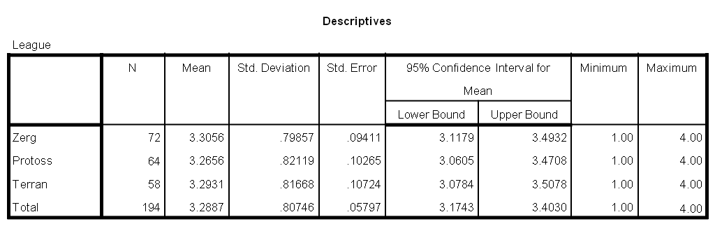 The purpose of this is to test if playing a specific race affects league placement. Given the nature of the variables, it is not meaningful to look at the mean and standard deviation. More importantly, there was a significant effect of race on league placement at the p<.05 level for the three conditions [F(2, 997) = 3.451, p = .032]. Another words, the relationship between race and league placement is unlikely to happen just by chance (3.2%). In layman term, race indeed affects your league placement.