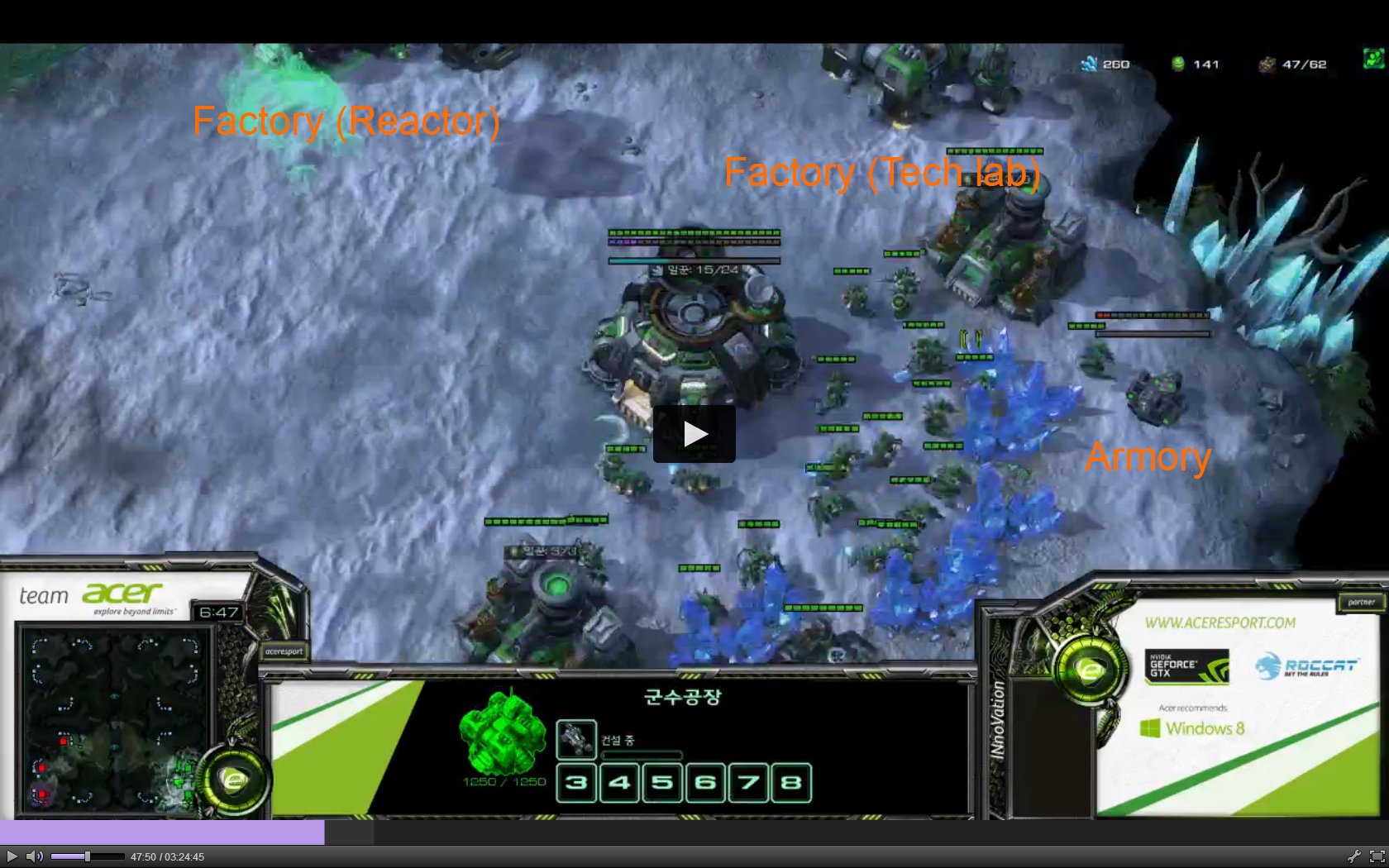 This is based on the fact that blue flame and transformation no longer crash. INnoVation opened up with a standard 14CC into Reactor Hellion. He takes an early second gas at 25 supply while the first Factory is building. After he swapped his Factory onto the Reactor (Hellion production), he builds a second Factory and uses the Barracks to build Tech Lab next to it. This is clearly shaping up to a blue flame build. The interesting part comes when he swapped the second Factory onto the Tech Lab for upgrade. At the same time, he puts down the Armory.