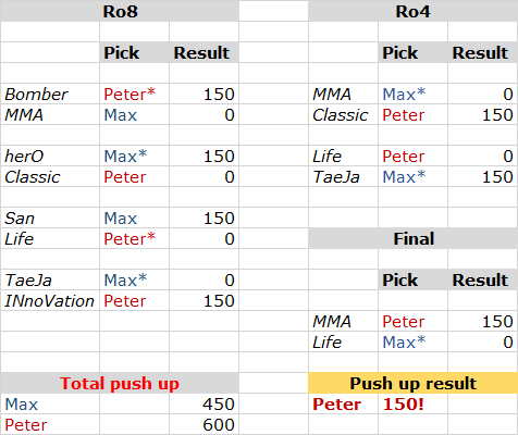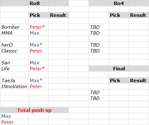 Although it seems like I have the first pick advantage, Peter has the slightly more obvious picks. For example, San vs. Life… (Cough*… sorry, but I will root for you San.)