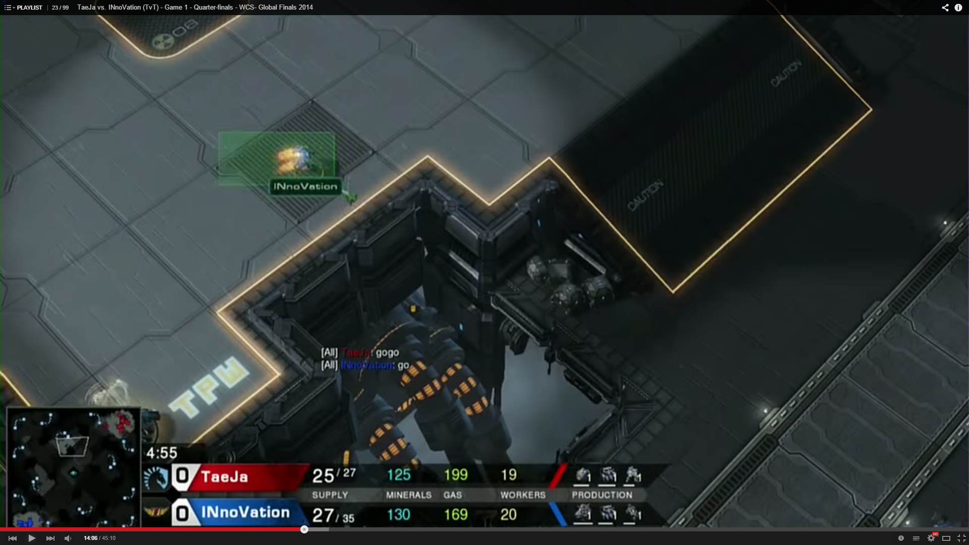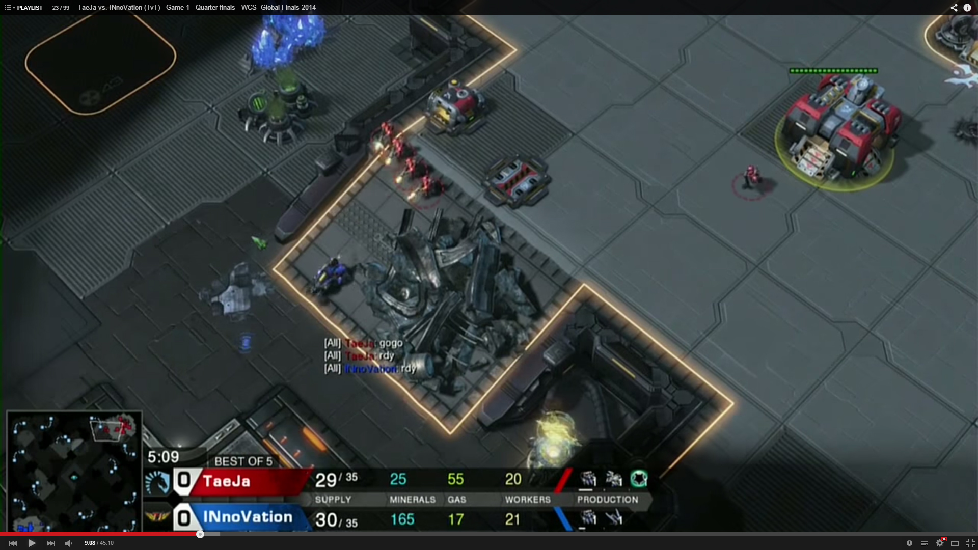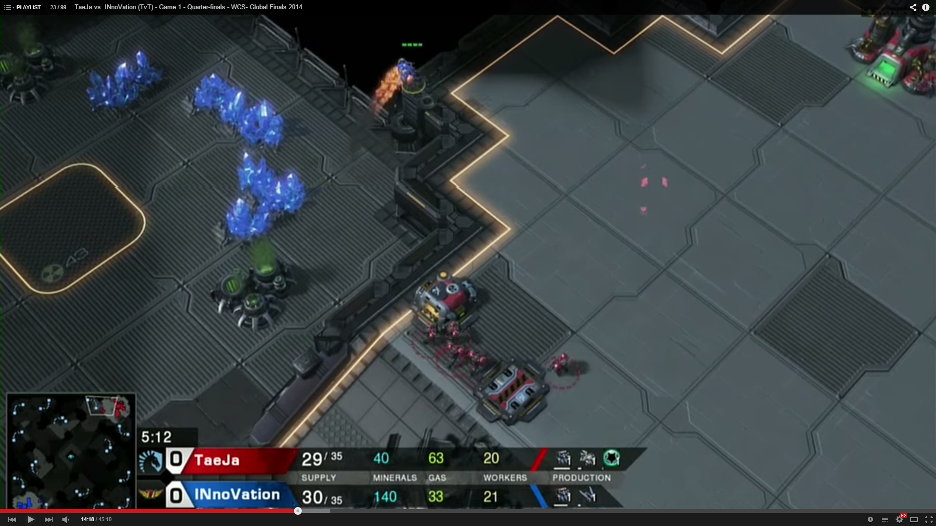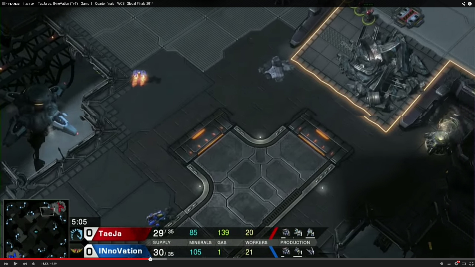 INnoVation was doing the gas first Reaper expand into mech build. His Hellion contacted Taeja’s Marines at the ramp. A single Hellion poking up the ramp at that timing suggested that INnoVation went for a gas first build. To read into it further, it could be one of the following builds