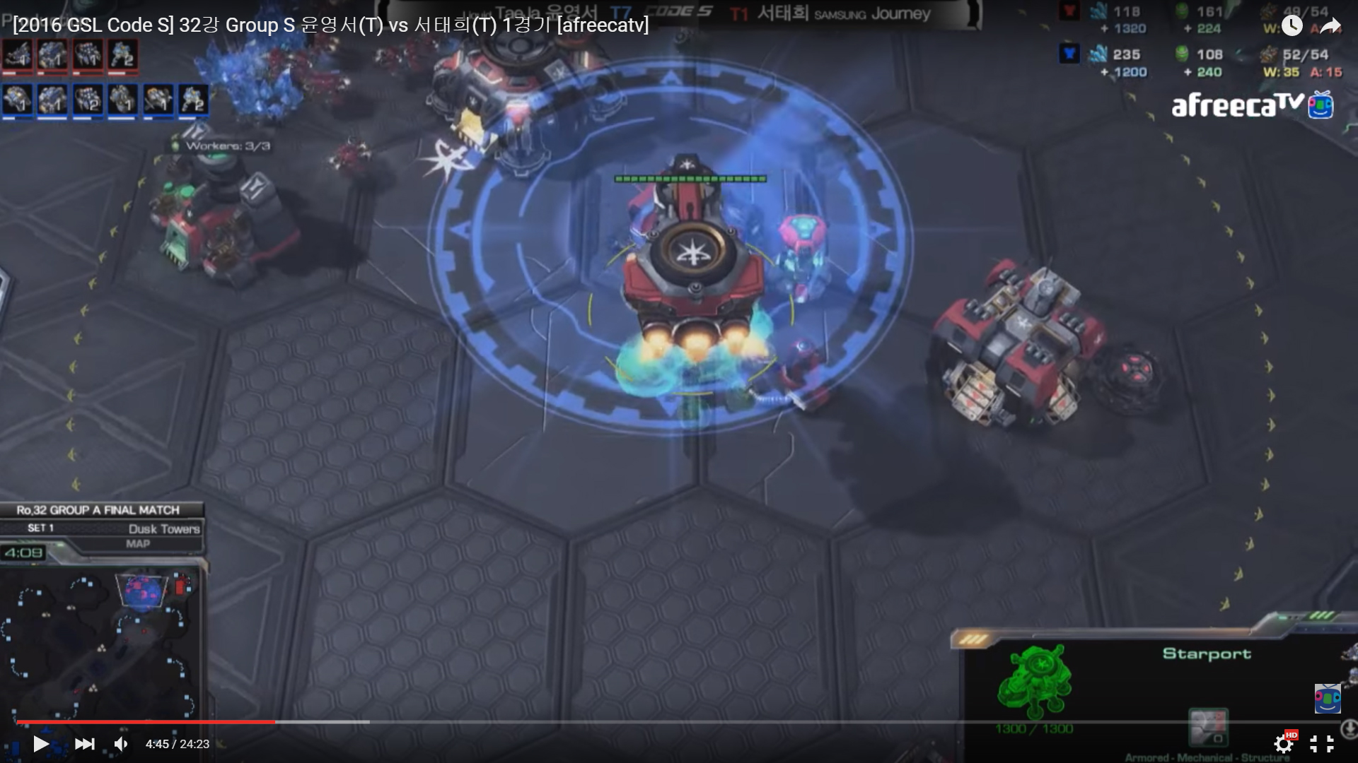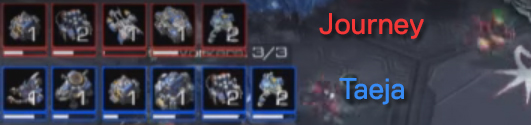 Taeja’s Command Centre is earlier, but his tech is delayed. Journey, who was using the metagame Reaper opening, had his Factory and Starport completed before Taeja’s. Thus, Taeja has to play the match up as a defender and not an offender in the early game. If Taeja can play this out until the standard Tank Medivac mid game without taking damage, he is ahead.