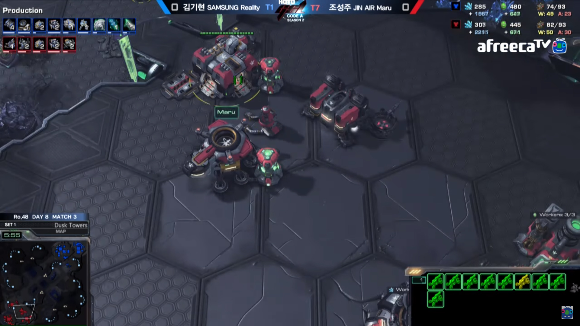 Dream had the same set up against Forte (see image above). Although Maru took an early third while Dream went for seemingly more common approach, this may just be the new mech convergent point. The Vikings’ ground attack basically won Dream the game when he saw that Forte was not producing Vikings like he did in mech mirror.