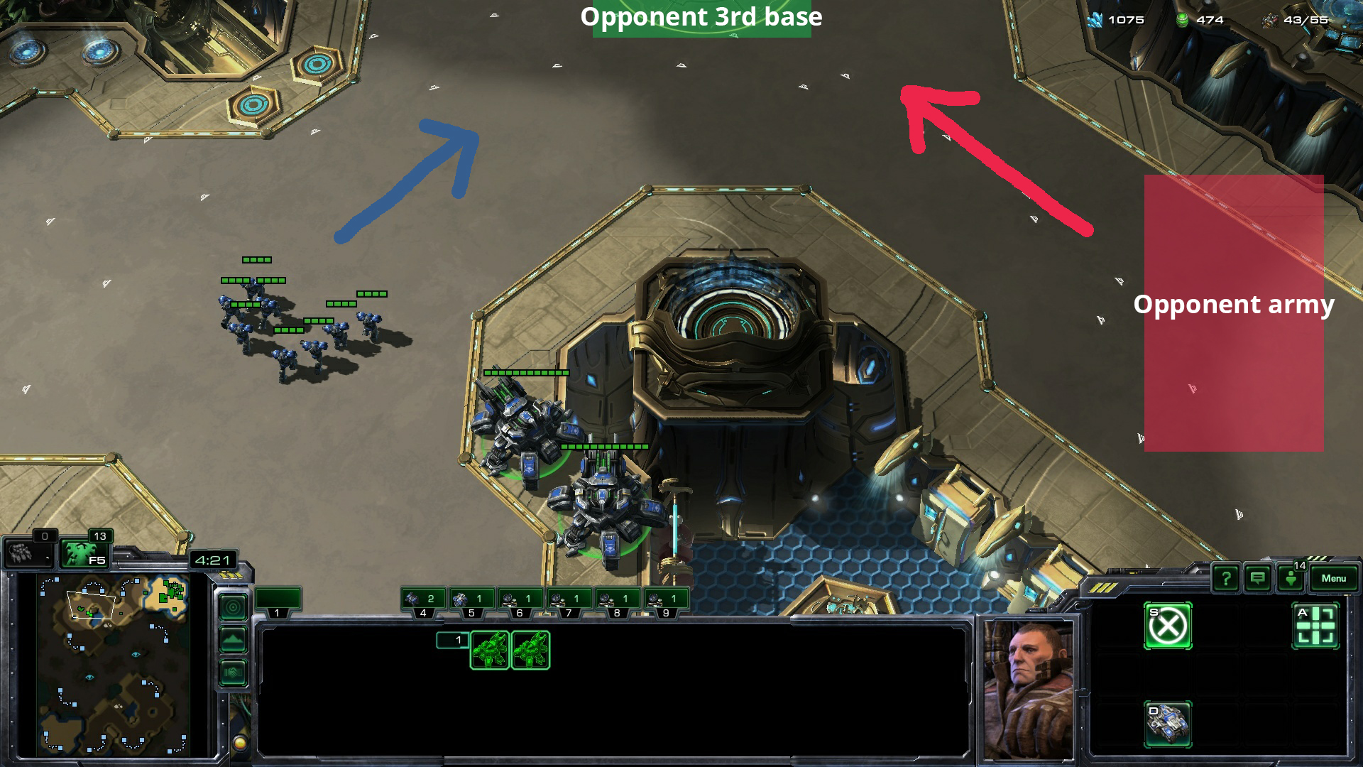 This is arguably the most common scenario in TvP and TvZ. Let say, you want to hit a timing when your Stim is ready, and you push out with your units including your Tanks. Your goal is to attack opponent’s newest (and usually the nearest) base with that force. A good example of such situation is the TvP build that I have previously discussed, and it hits a timing with two to three Tanks that can potentially destroy Protoss’ third. Below vod is an example of how to execute it.