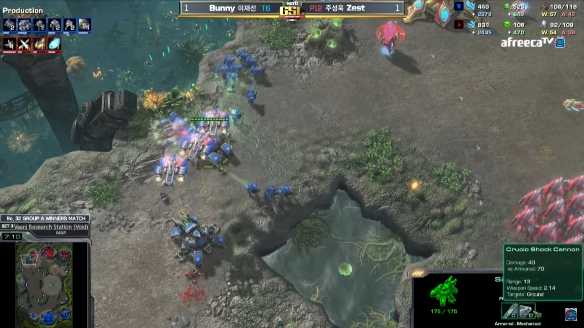 In a bio based composition, Tank is used as a supportive unit for your bio force, which is your core. In TvZ for example, Your bio units do the main damage, but they cannot defeat any typical Zerg composition by themselves. Against a Zergling and Baneling based composition (let’s leave other support options like Widow Mine out of discussion), bio alone will always get swamped to death in a sizeable battle under normal circumstances no matter how godly your micro is. Tank’s aoe damage is cost efficient against this composition, and you can target fire Banelings before they get in range with the bio. Against a Roach and Ravager based composition, the bonus damage against armored units (Roach) is huge. The fact that both sides are using range units, it is awkward for Zerg to ignore the bio and try to get in range to hit the Tanks. If Zerg use Hydralisks in the Roach composition, Siege Tank is the answer against that. Generally, Hydralisks destroy bios without Tank support, because Hydralisks out-range Marines, and Marauders are very ineffective against Hydralisks even though they have the same range. In contrast, in a mech based composition, Tank is the core of the army, and other units are considered to be supportive units. An obvious example is in a bio versus mech TvT game, the Hellbats of the mech player play an important supportive role to block the bio units from getting in range of the Siege Tanks. Without them, bio units can easily stim and destroy the Tanks.