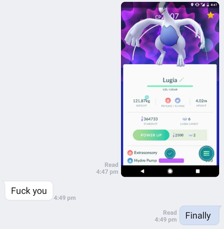After a long day of work yesterday (lots of procrastination with Starcraft vod), I met up with some strangers from a Pokemon Go discord channel for another Lugia raid. I was quite desperate to get a Lugia, because I had failed quite a number of times for the last three days. I felt more tense than doing a doom drop without a scan when I got into the capture screen.