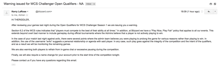The second issue is the handling from Blizzard. THERIDDLER received a warning from Blizzard for “not actively playing to win”. See the image below.