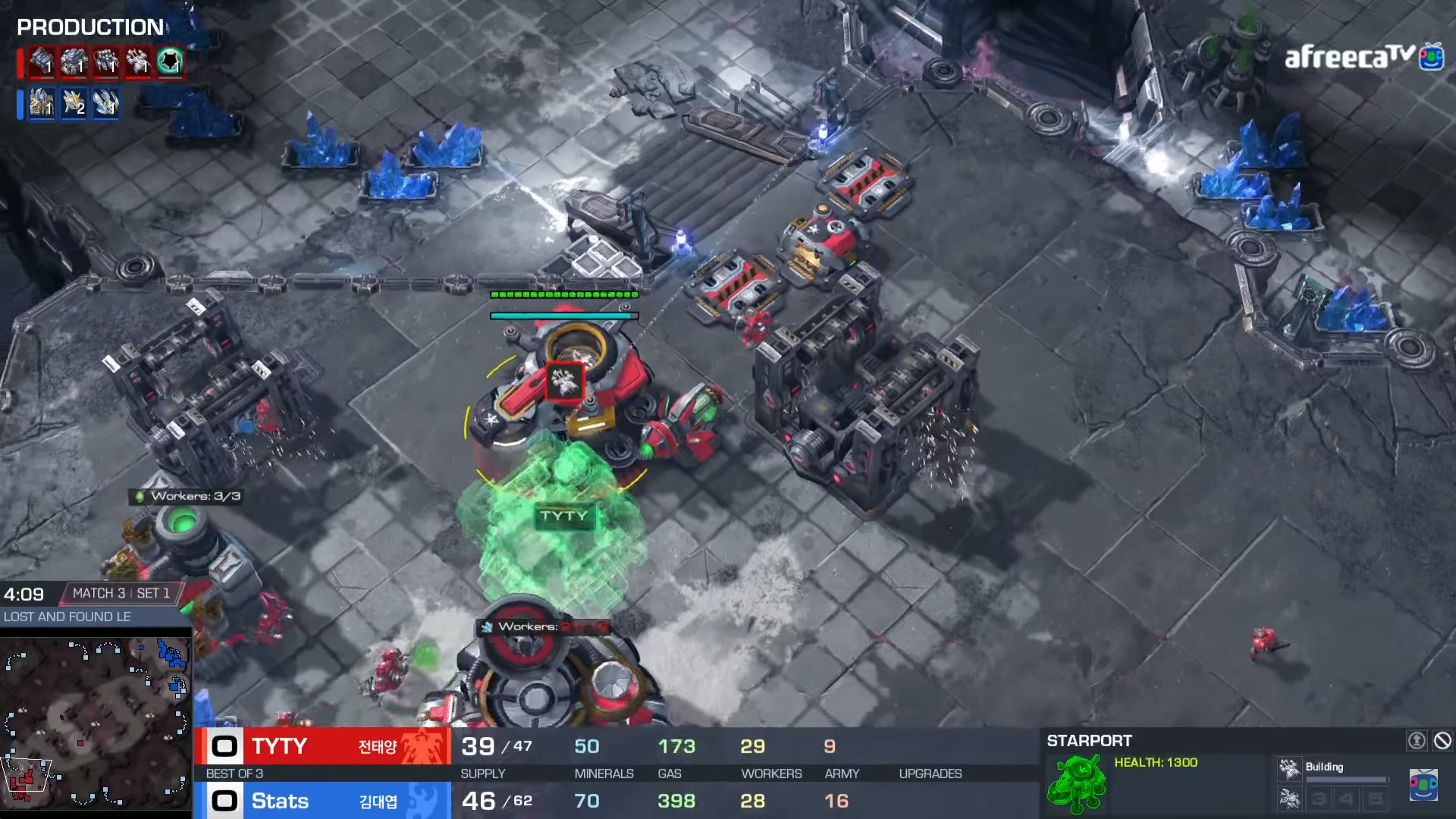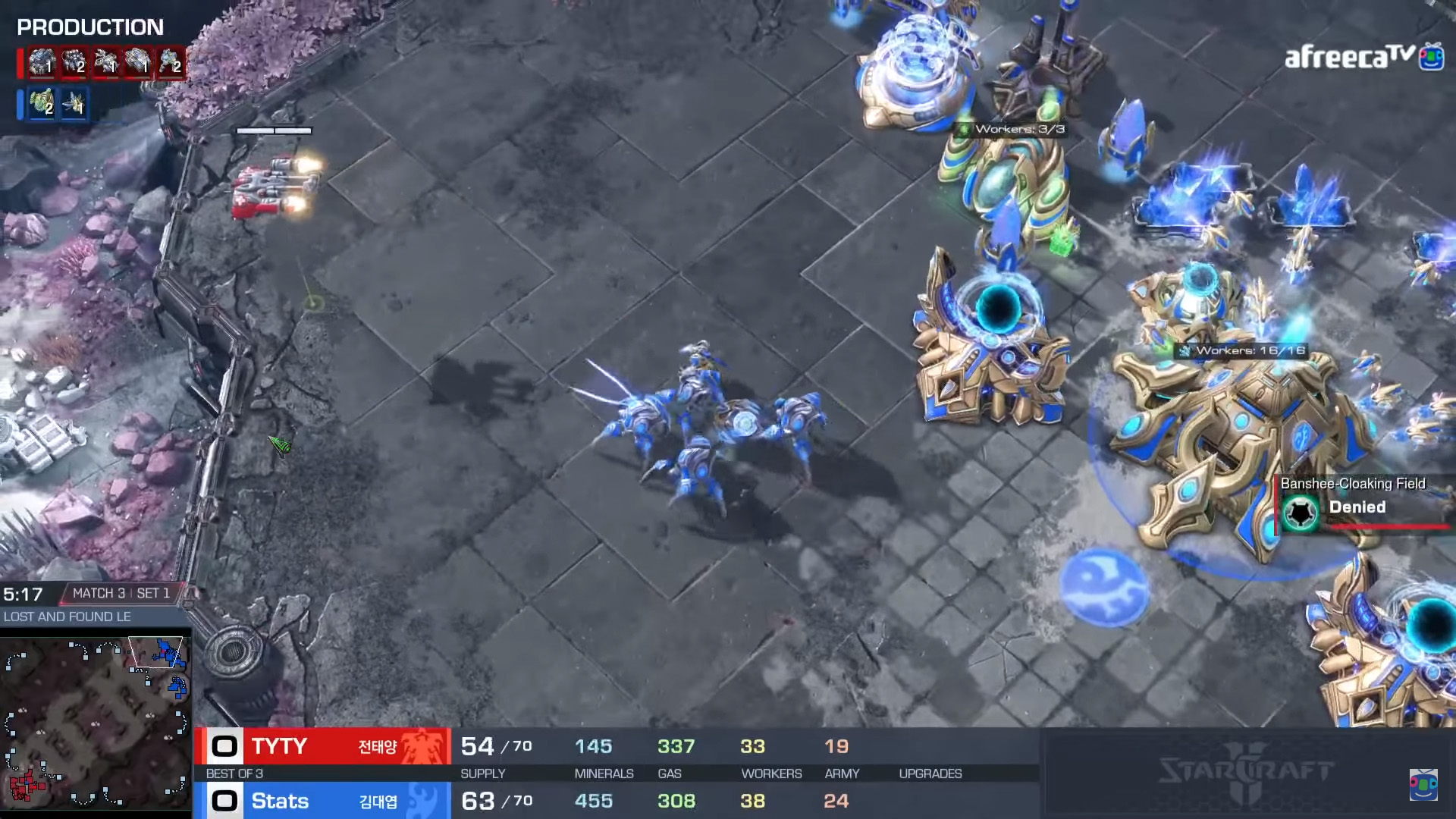 TY reacted by continuing to make a second Cyclone and built a Starport in base. The Starport was for a Medivac and subsequent Cloak Banshees. The Medivac was for the two Cyclone. This is probably the best option to force Protoss to have the units in his base. The subsequent Cloak Banshee does not only serve the same purpose, but it also has the potential to help TY come back from the early game deficit. This can then transition to the typical Cloak Banshee TvP build.