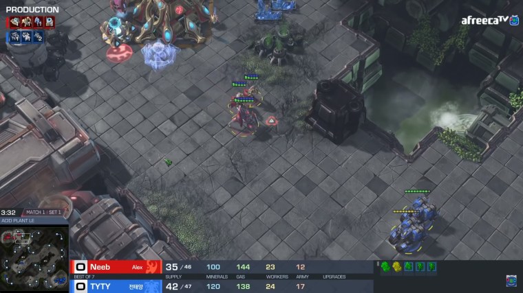In the image below, Neeb does not know whether TY is having another pair of Cyclone on the way. In Neeb’s mind, TY may be pulling Scvs for an all-in with four Cyclones. TY has previously shown that proxy Reactor Cyclone all-in is in his build arsenal (see the vods that I have already linked earlier). As you can see in the production tab in the image below, TY is following it up with a Hellion drop, and that requires Neeb to position some units in the main. Protoss do not have such a high degree of uncertainty if Terran were to build the buildings in base.