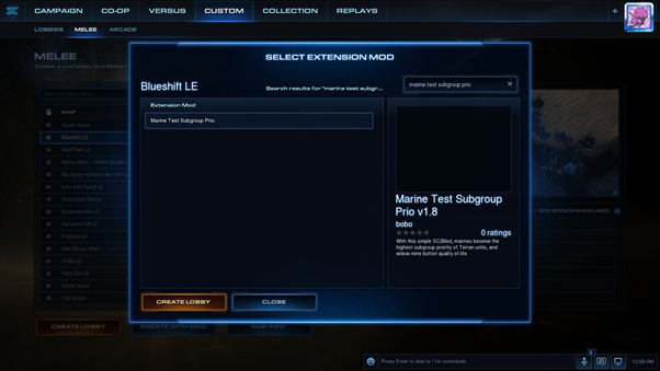 Once completed, you now can load SC2 and prepare a Melee Custom Game with Create With Mod. Search for the Extension Mod you want: here use my demo Terran QoL .SC2Mod called “Marine Test Subgroup Prio” and play as Terran against a friend or whatever AI, and reproduce the first picture – gl hf.