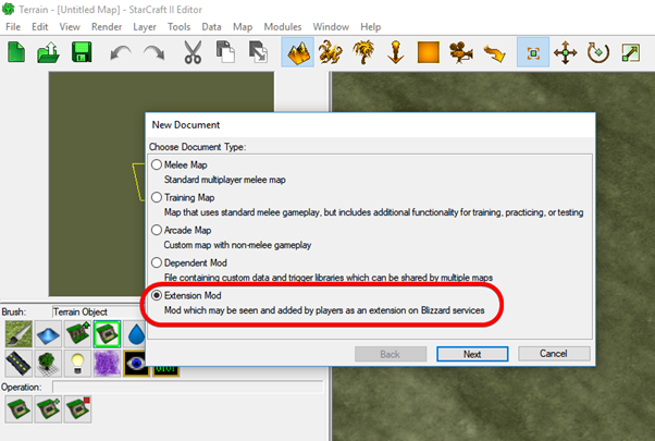 First, launch the SC2 map editor. Like most old-school Windows programs, you want to make File=>New… and create an Extension Mod.