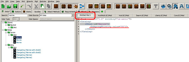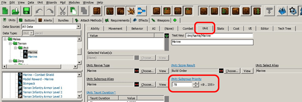 There are many tabs. Browsing in the Unit tab, “Unit Subgroup Priority = 78” will be found. Same method applied for Ravien would give “Unit Subgroup Priority = 84”. In order to get Marine prio higher than Raven let’s set proper marine’s one to 85 and View=>.XML view.