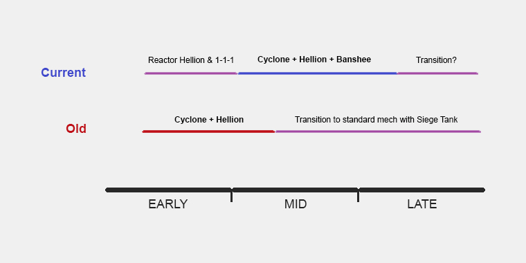 Uthermal did not transition out of Cyclone and Hellion in his games, and this signals that a Siege Tank transition may not be necessary. Consistent with the notion that the old Cyclone does not scale well, the old style transitions to a more typical mech composition with a focus on Siege Tank. The current Cyclone is in fact the main mid game unit that sort of replaces Siege Tank. Recently, however, newer games showed that Terran players tend to mix in some Siege Tanks. See vods below for examples.
