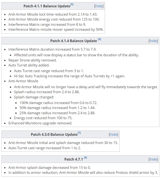 Blizzard nerf Anti-Armor Missile’s damage from 30 to 15 in patch 4.3 as attempt to discourage this play style. However, while the nerf definitely made mass Raven weaker, players still use mass Raven in late game in TvT and TvZ. Anti-Armor Missile’s damage was later nerf to 0 in patch 4.7 to remove this play style completely. Blizzard’s rationale was that, and I quote, “the intent is for Anti-Armor missile to be used as a debuff and not for its damage, we want to emphasize this purity of purpose.” Put it in another way, they want Raven to be used as a support unit in low number, and being mass-able does not align with its intended design.