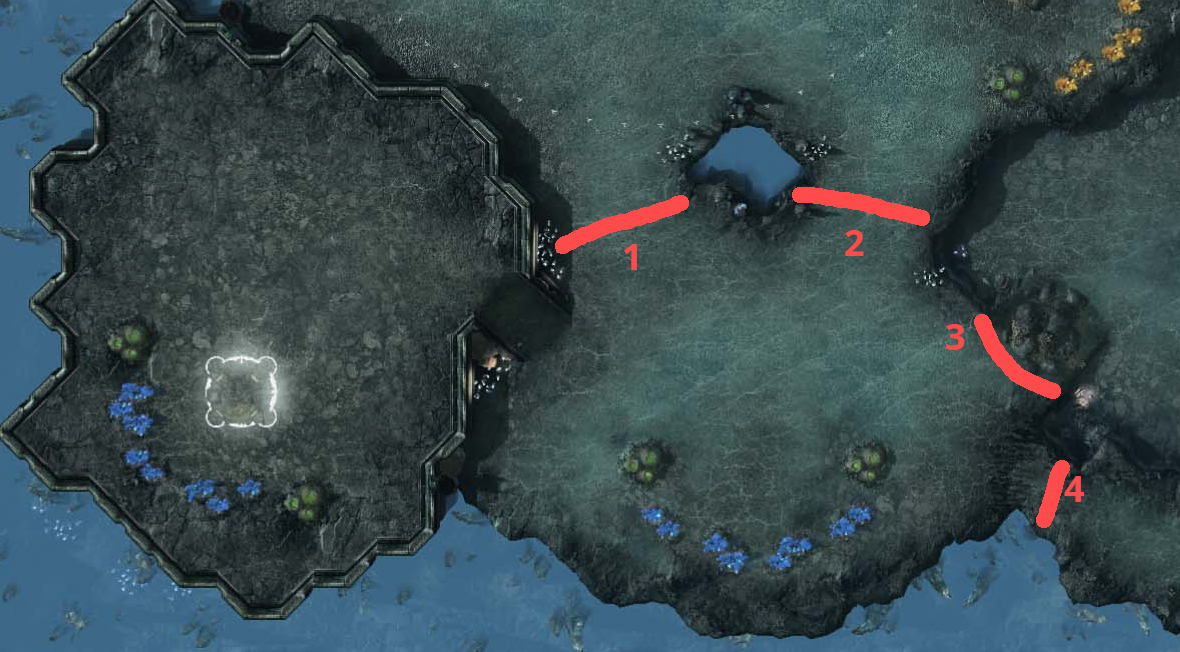 You can tell that the mapmakers felt confined by the combination of players’ preferences and game design principles related to racial asymmetry. What I find interesting is how these restrictions are “enlarged” as time progresses. This is particularly obvious when you revisit maps from the early Wings of Liberty days. Let’s use Xel’Naga Caverns as an example (see image below). The natural is extremely vulnerable. It has a wide enough entrance at 1 and 2 that you can’t wall off early. There are alternative paths at 3 (destructible rocks) and 4 (bush).