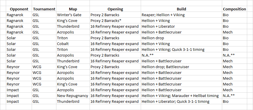 Maru only uses 1-1-1 variations for his builds. Previously, we can categorise builds into 1-1-1 variations and 2-1-1, but 2-1-1 is pretty much dead since early 2017. Interestingly, Maru was the only one that made 2-1-1 work in 2018 when he won every GSL of that year. As shown in the table, the 1-1-1 variations are always reactor Hellions plus a unit from the Starport. Terran players have been doing this since forever.
