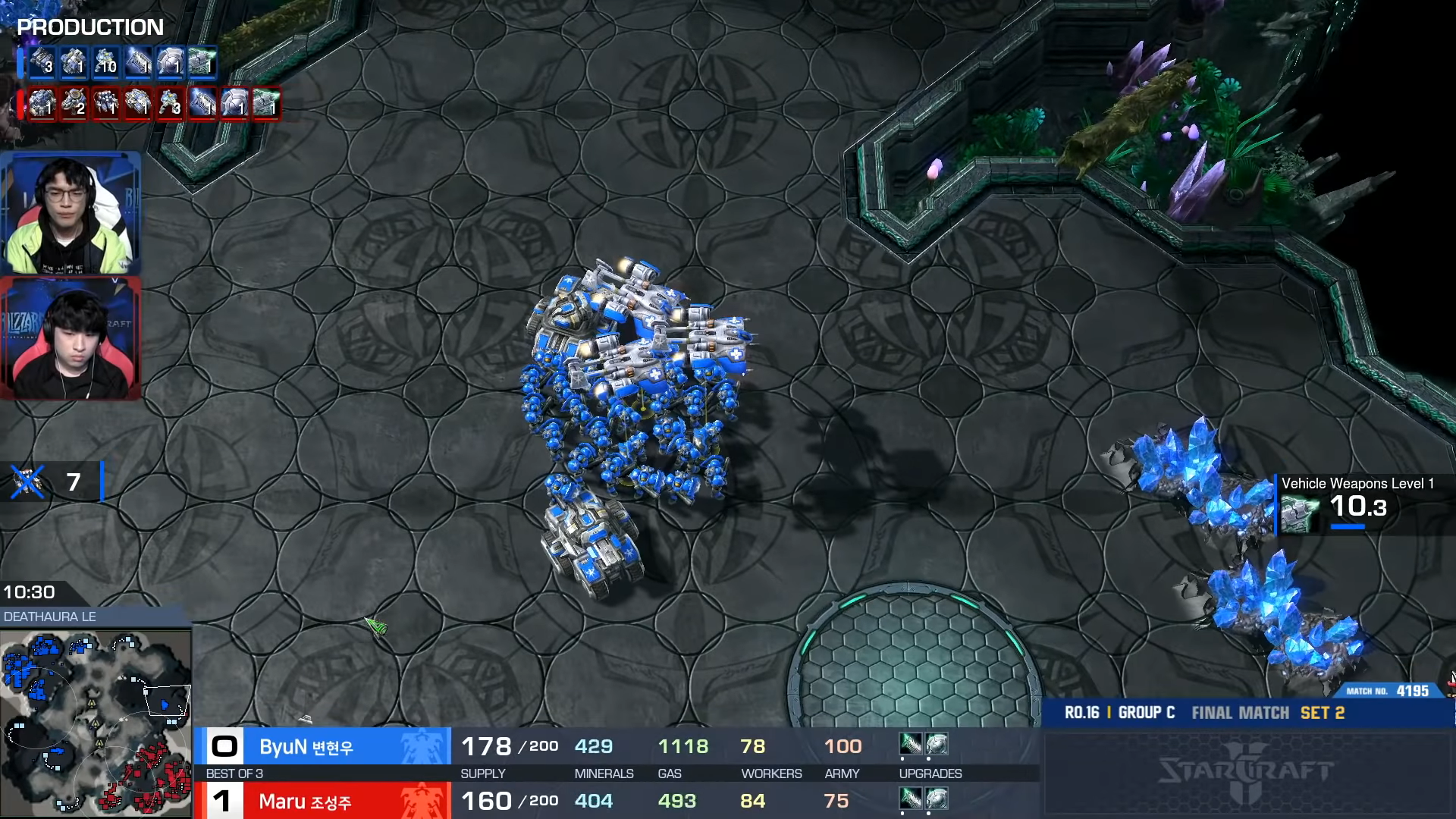 During the late to late-late game stage, Maru can trade cost-inefficiently, especially to an opponent who has air control, as opposed to the mass Marine, Siege Tank, Medivac style shown by other players (e.g., ByuN and Bunny). Maru has the flexibility to look for one decisive engagement to end the game, as shown in the first vod below. In this game against Innovation, Maru faced a composition that tried to walk a fine line between a decent Tank count and a good Viking Liberator count. Against Clem’s composition in their game on Deathaura, in which Clem committed extremely heavily to Vikings and Liberators, Maru was able to eek out the win by taking inefficient fights the entire game, but forgo his Siege Tanks in favour of a higher Marine count and extreme mobility. Beginning with Clem’s siege of Maru’s eastern rich gas base (see second vod below), Maru chose to instead swing clockwise all the way to Clem’s rich gas base instead of defending, and with his extremely mobile force was able to burst down three bases while Clem managed to take out the base he initially sieged.
