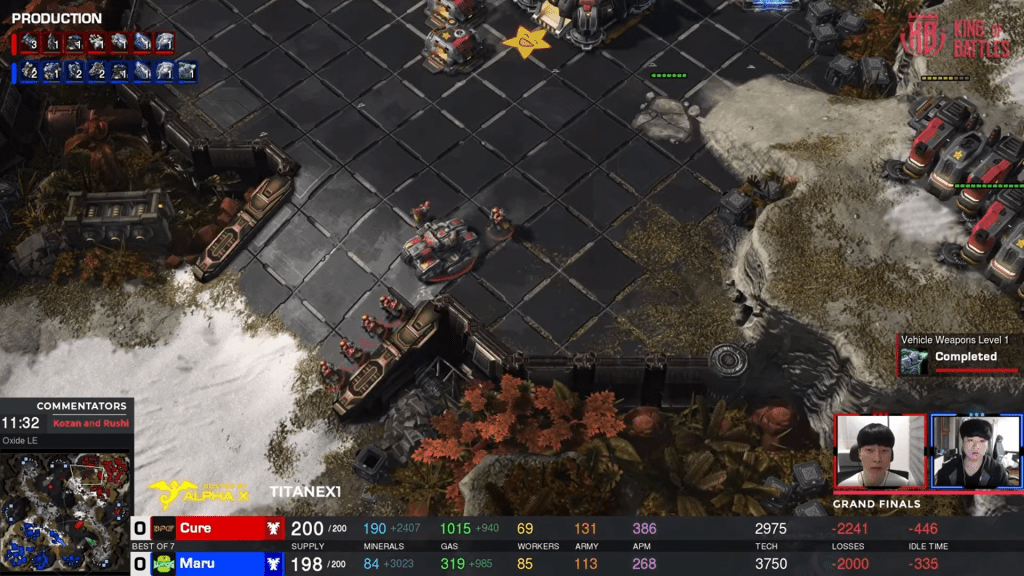 The key battle of the mid game is securing the third mining location and dealing with Ravens, Vikings, and Siege Tanks push. Again, players have to choose between attacking and defending. Maru likes to be the defender in this stage of the game, and his main goal is not to let the opponent’s push get into a good position. He would keep producing Siege Tanks and Vikings, and the defender advantage would the rest.