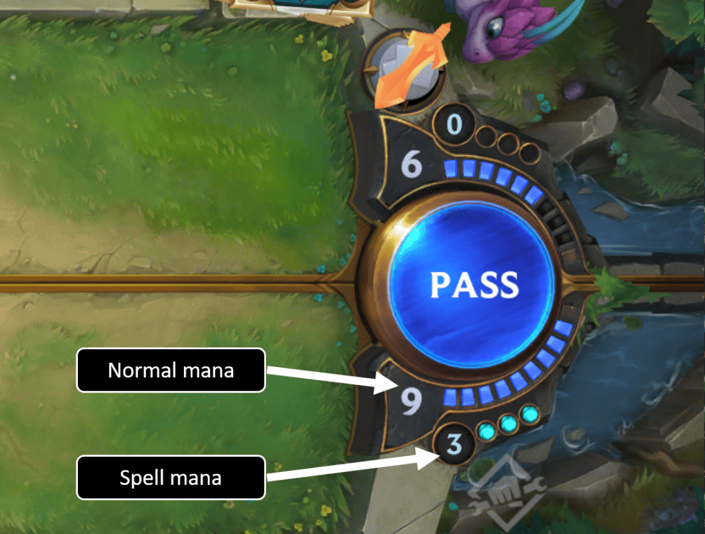 LoR uses a “no-land” mana system, whereby the players automatically get one additional mana each turn like in Hearthstone. This system obviously doesn’t have the land flood and land drought problems that we see in games like MTG and Pokemon, but it feels punishing when you do not spend your mana. This often results in missing a “drop” in the first few turns to be a sizable disadvantage. LoR addresses this issue with the spell mana system (see image below):